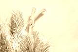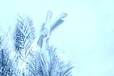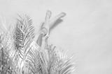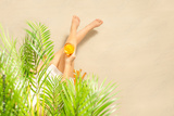Alone woman sitting under palm tree branches with glass of water with piece orange. Female relaxation on the sand of the beach at summer vacation. Top view