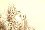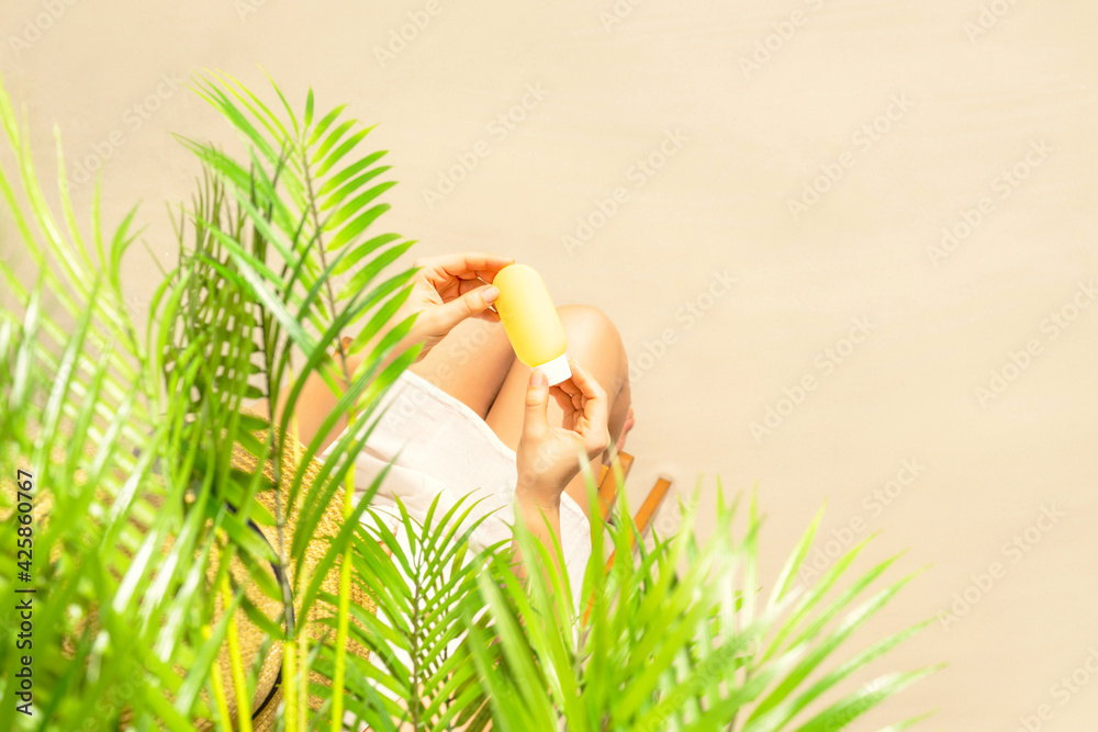Alone woman applying sunscreen on skin sitting under palm tree branches. Female relaxation on the sand of the beach at summer vacation. Top view