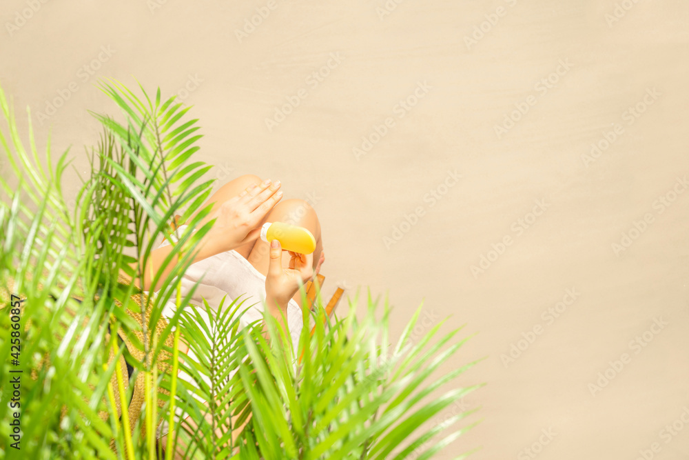 Alone woman applying sunscreen on skin sitting under palm tree branches. Female relaxation on the sand of the beach at summer vacation. Top view