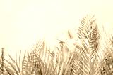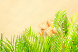 Alone woman applying sunscreen on skin sitting under palm tree branches. Female relaxation on the sand of the beach at summer vacation. Top view