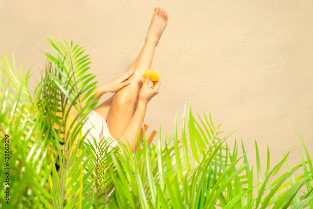 Alone woman applying sunscreen on skin sitting under palm tree branches. Female relaxation on the sand of the beach at summer vacation. Top view
