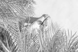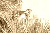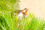 Alone woman sitting under palm tree branches with glass of water with piece orange. Female relaxation on the sand of the beach at summer vacation. Top view