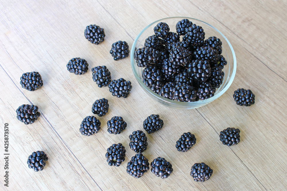 Fresh blackberries on wooden background, close up of berries juicy ripe fruit
