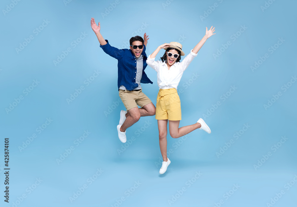 Happy Asian couple tourist jumping celebrating to travel on summer holiday isolated on blue background.