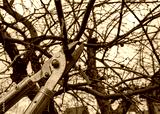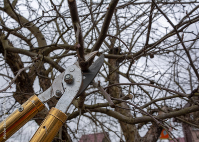 Pruning fruit trees with pruning shears. Scissors cut branches. Work in the garden in spring and autumn.
