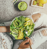 Woman in jeans holding fresh healthy greeen salad with avocado, kiwi, apple, cucumber, pear, greens and sesame on light background. Healthy food, clean eating, Buddha bowl salad, top view, detox