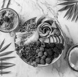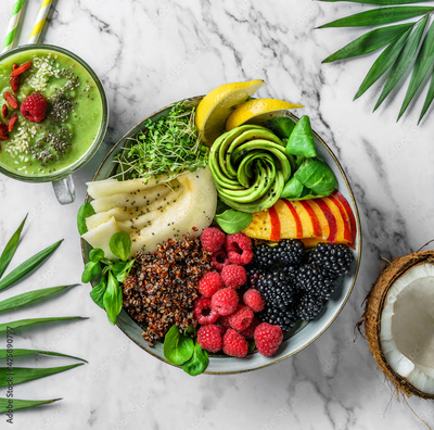 Fresh summer salad with quinoa, peach, micro greens, avocado, berries, coconut, melon on light marble background with tropical leaves. Healthy food, clean eating, Buddha bowl salad, detox, top view