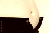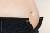 The fat man's belly does not fit in his pants