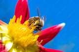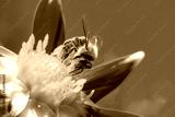 A honey bee collecting pollen at stamens in a flower. A bee working on a garden flower.