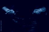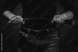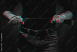 Handsome guy with a BDSM whip in his hands. Black and white with 3D glitch virtual reality effect