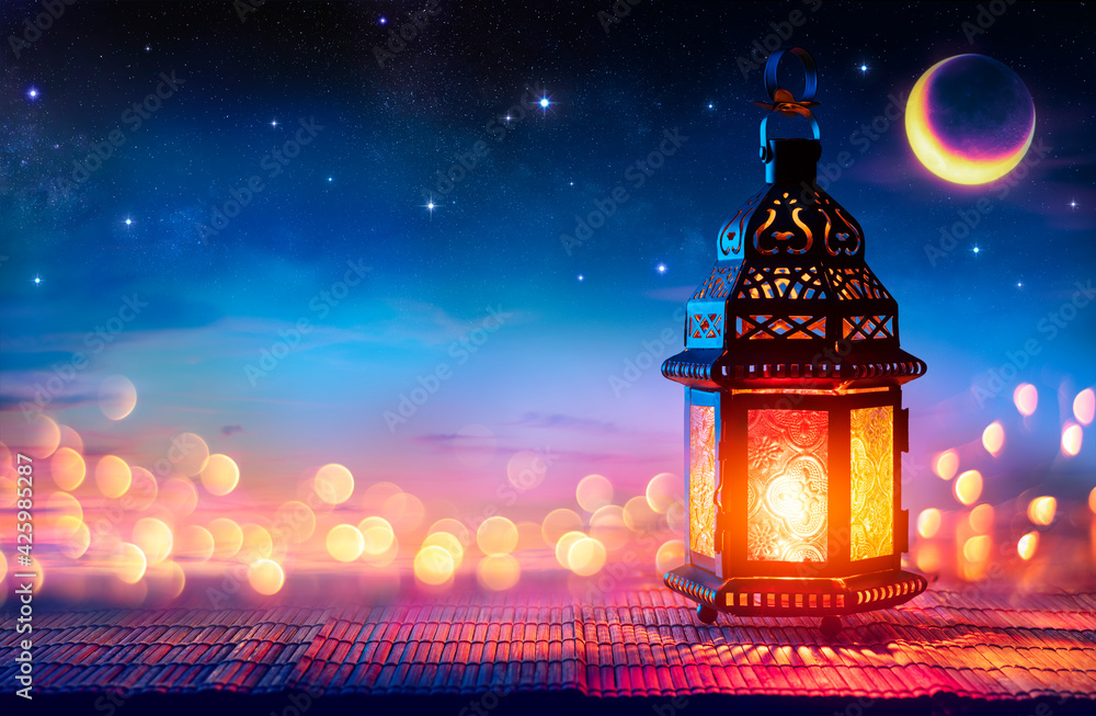 Muslim Holy Month Ramadan Kareem - Arabic Lantern With Burning Candle And Bokeh Glowing At Evening - Eid Ul Fitr