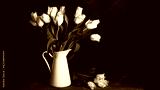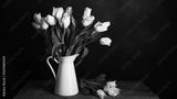 Tulips in a jug. Classic still life with a bouquet of tulip flowers in a vintage white jug on a dark background and an old wooden table. The style is black and white.