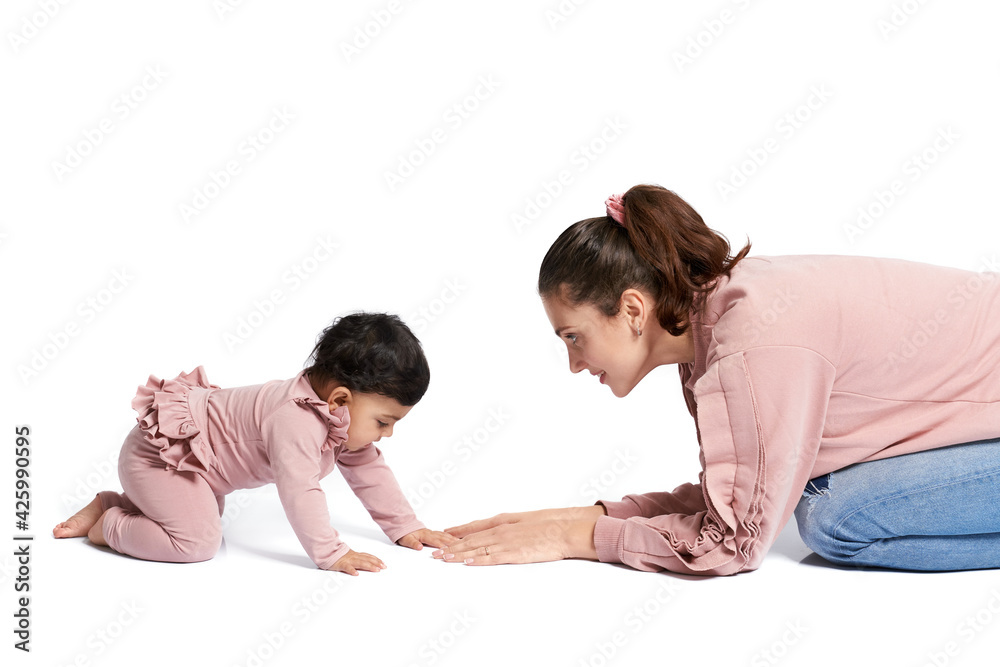 Side view of mother teaching baby daughter crawling, isolated on white background. Young woman having fun, playing with sweet adorable child while sitting on floor, happy childhood, mother care.