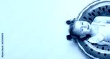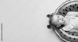 Top view of funny little child girl dressed in a swimsuit lying on an inflatable color red ring on yellow studio background. Summer travel concept. Banner, mock up, copy space