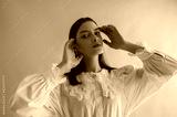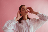 Young beautiful fashionable brunette girl wearing stylish white vintage cotton shirt with lace collar, posing on pink background