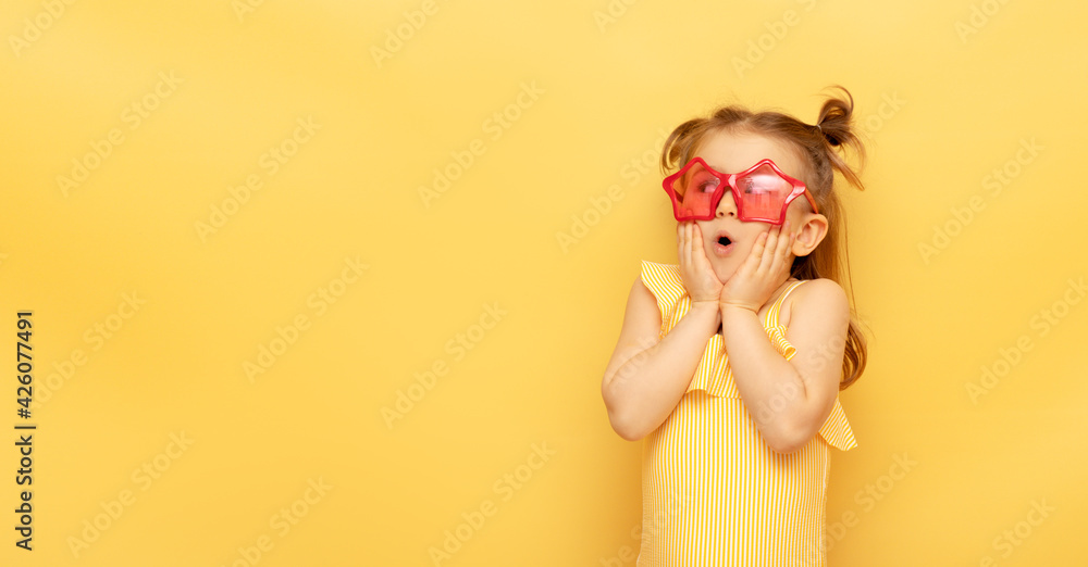 Little child girl in striped swimsuit and red funny summer sunglasses surprised expression looks at camera posing on yellow background, studio portrait.Advertising of children's products and sale