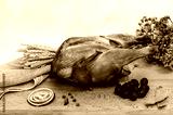 Meat, smoked, grilled chicken with herbs and spices on a wooden board on a light background, close-up.