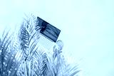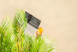 Alone woman freelancer holding glass of water with piece orange working on laptop sitting under palm tree branches on the sand of beach. Summer vacation. Top view