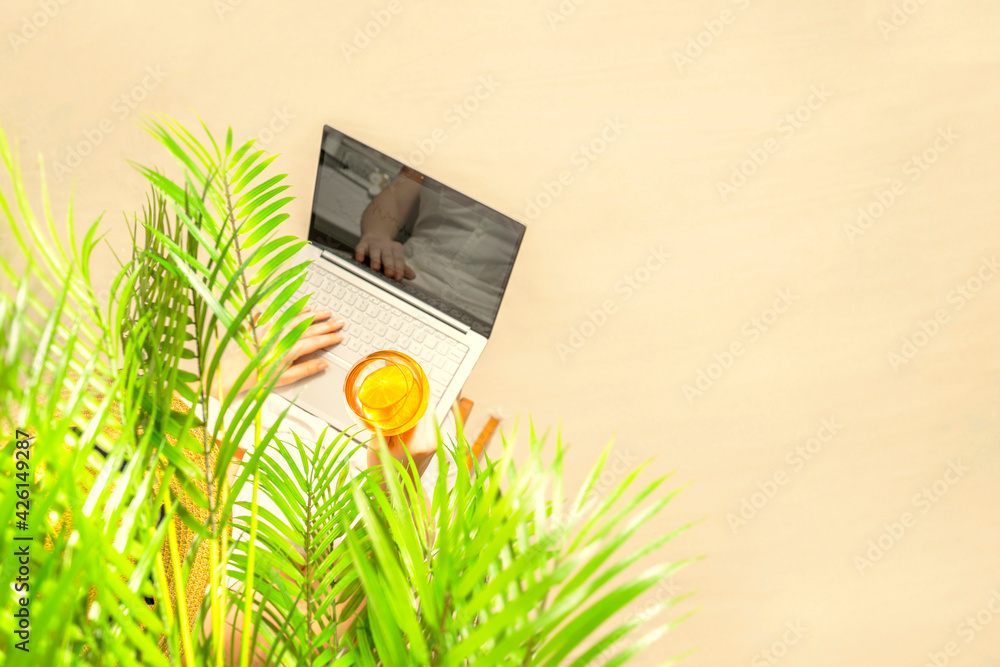 Alone woman freelancer holding glass of water with piece orange working on laptop sitting under palm tree branches on the sand of beach. Summer vacation. Top view