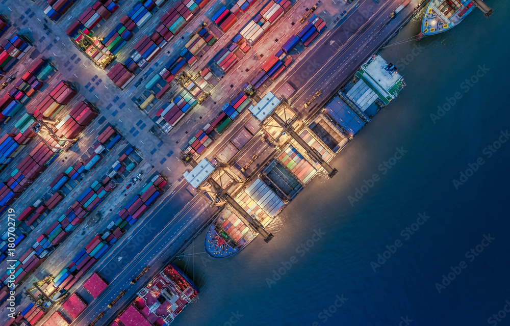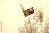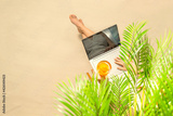 Alone woman freelancer holding glass of water with piece orange working on laptop sitting under palm tree branches on the sand of beach. Summer vacation. Top view