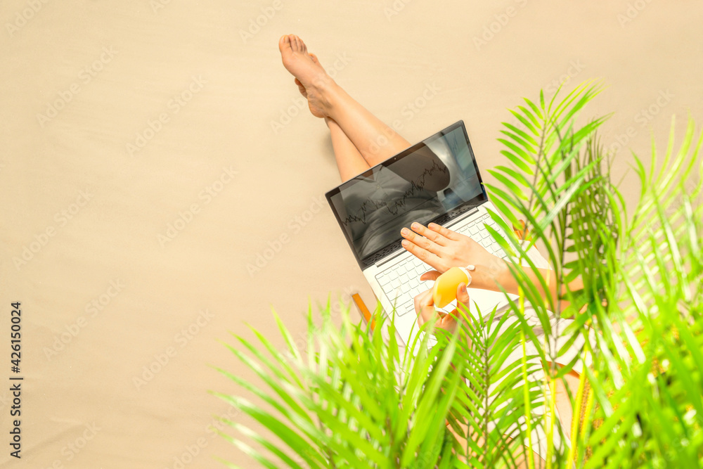 Woman with laptop applying sunscreen on skin sitting under palm tree branches on the sand of beach . Summer vacation. Top view