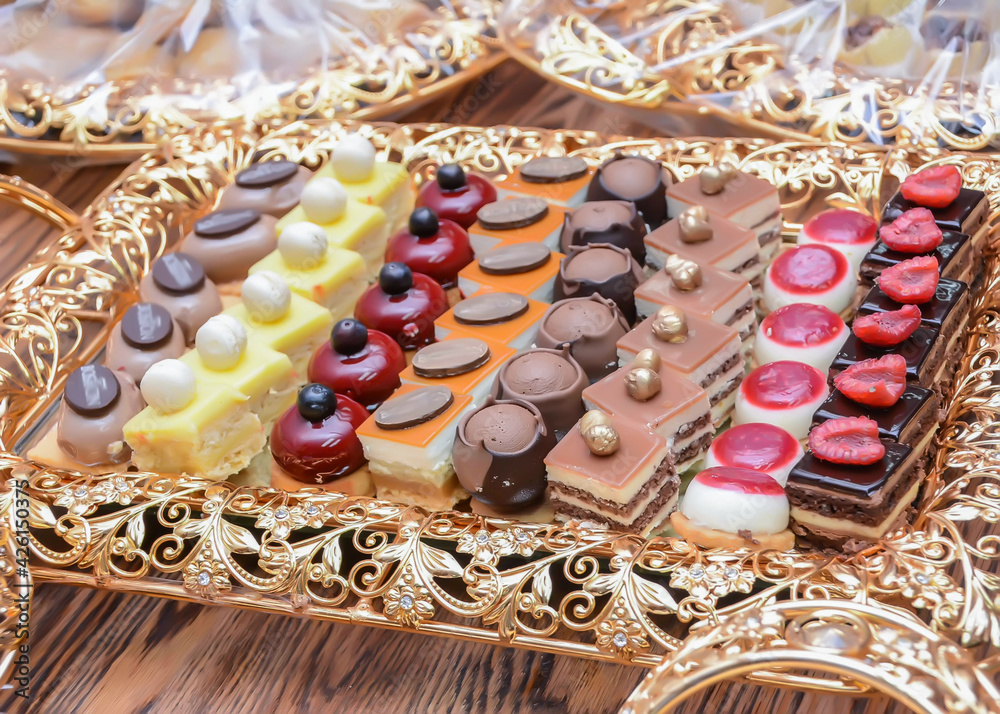 Colorful display of pastries topped with fruits (shallow depth of field)