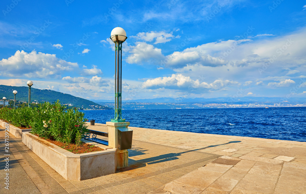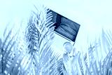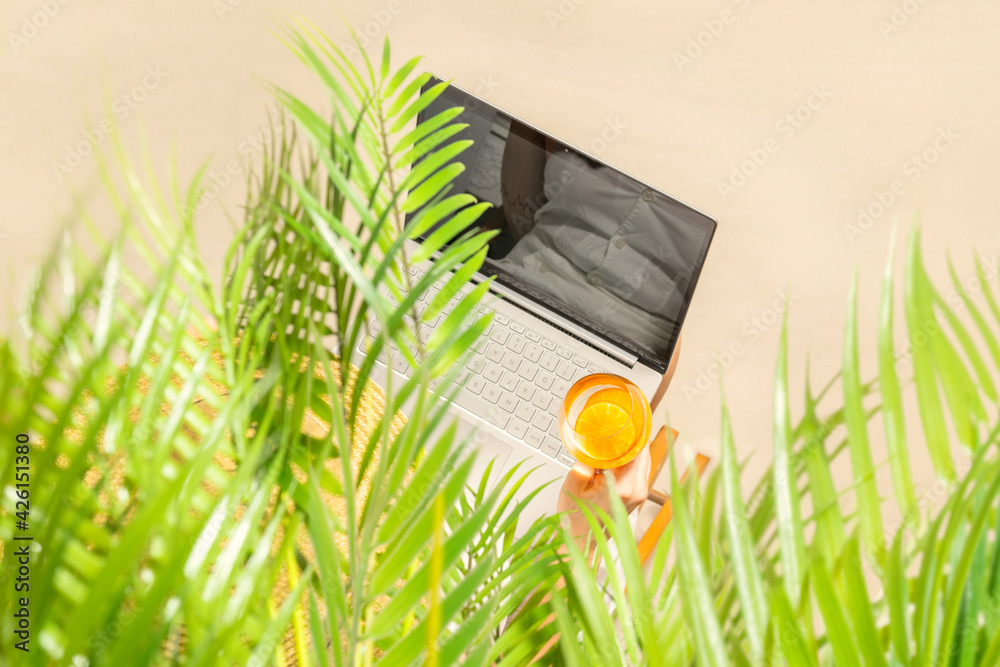 Alone woman freelancer holding glass of water with piece orange working on laptop sitting under palm tree branches on the sand of beach. Summer vacation. Top view