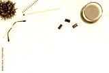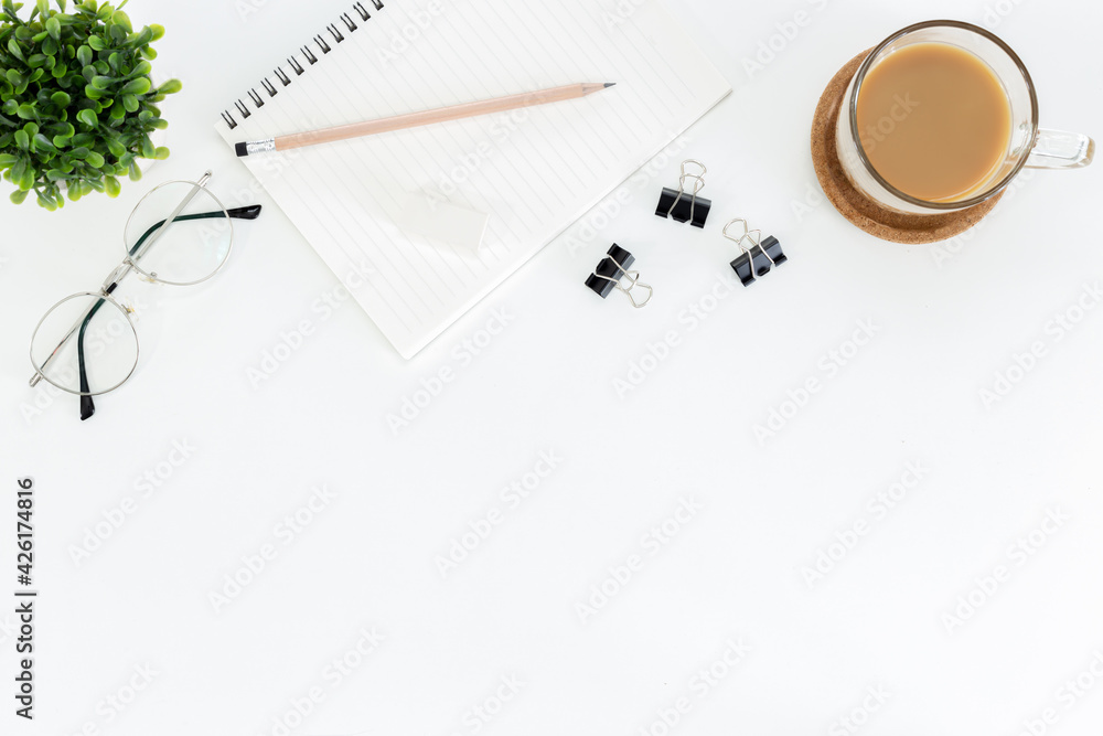 Top view workspace with coffee cup,, paper, notebook and pencil with copy space, isolated on white color background