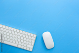 Top view white keyboard and mouse isolated on blue background with copy space