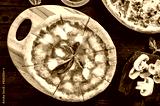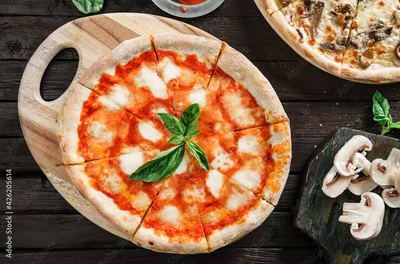 Pizza Margherita with cheese, tomatoes and basil on dark wooden background. Vegetarian pizza, top view