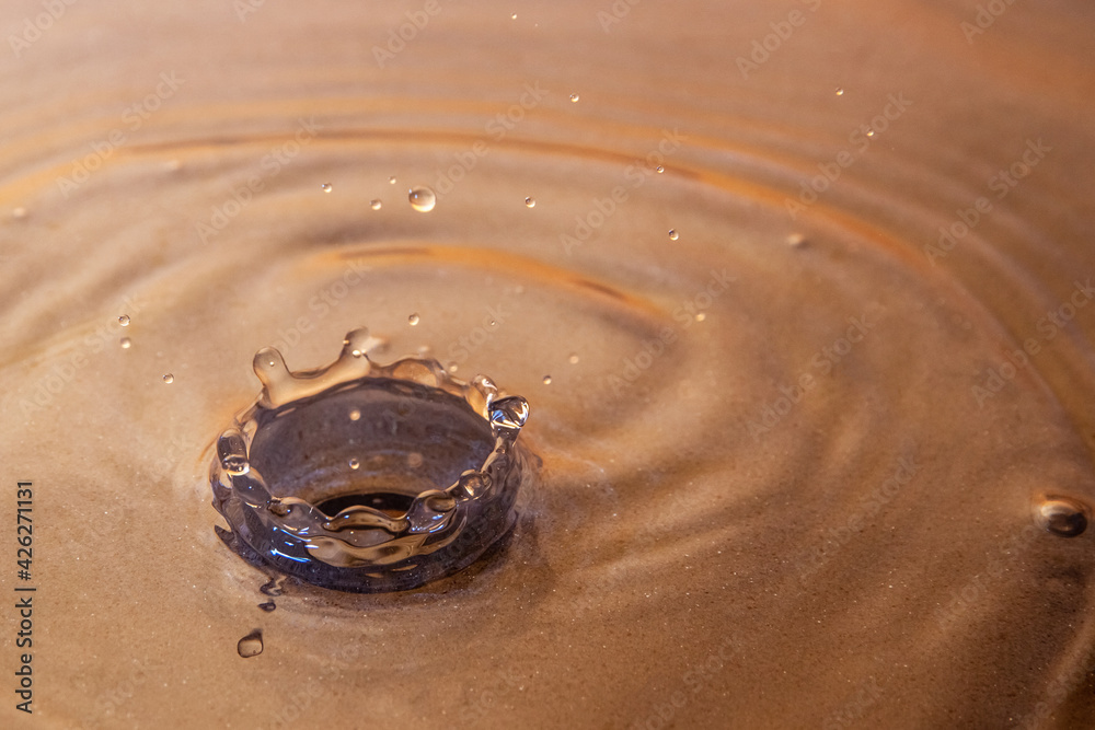Splashes of water with flying drops on macro photography. There is a sandy bottom under the water