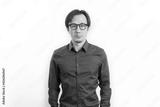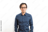 Adult handsome asian business man standing and looking to camera isolated on white background.