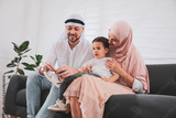 Happy Muslim family spending time together on sofa at home