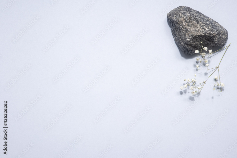 Dry white flower and stone on a light blue pastel background. Trendy, minimal concept with copyspace, Aesthetic, minimalism