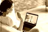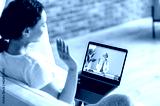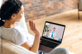 Distance medical help, online medical consultation. Pregnant woman talks with a female doctor by video call uses laptop, getting medical consultation, receives answers to questions and recommendations