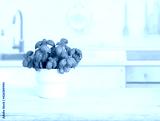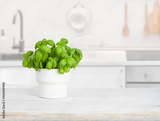 Pot with basil on wooden table in blurred kitchen interior