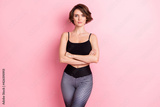 Photo of serious confident young woman gym trainer fit motivation isolated on pastel pink color background