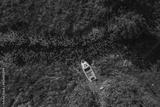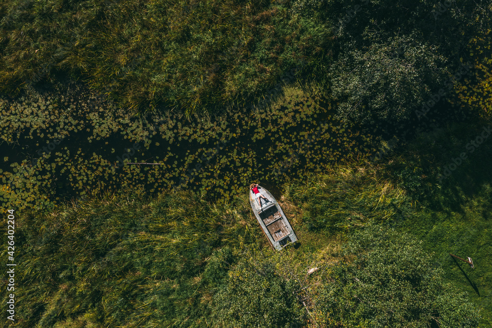 View from above of curly girl enjoying a sunbathing is relaxed enjoying her vacation lying on the old boat. Summertime