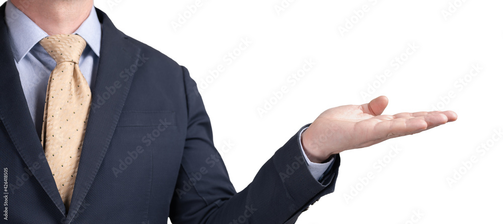 man with his palm up over white background. businessman hand holding empty space for your text or design , isolated on white. Template, copy space