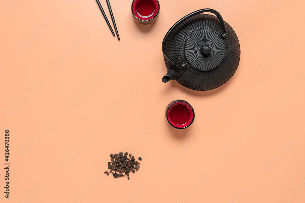 Traditional Asian tea ceremony. Black metal teapot, tea in cups on a pink pastel background. Creative layout. Top view.