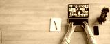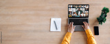 Online business briefing, virtual meeting. Panoramic photo of laptop screen with webcam shots of multi ethnic business partners communicates from home by a video conference, online webinar. Copy space