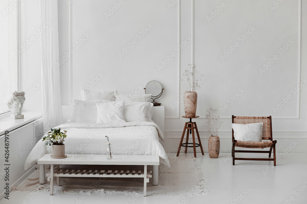 Cozy bedroom interior of vintage armchair, wooden coffee table with flowers in vase, light bed and other decor accessories