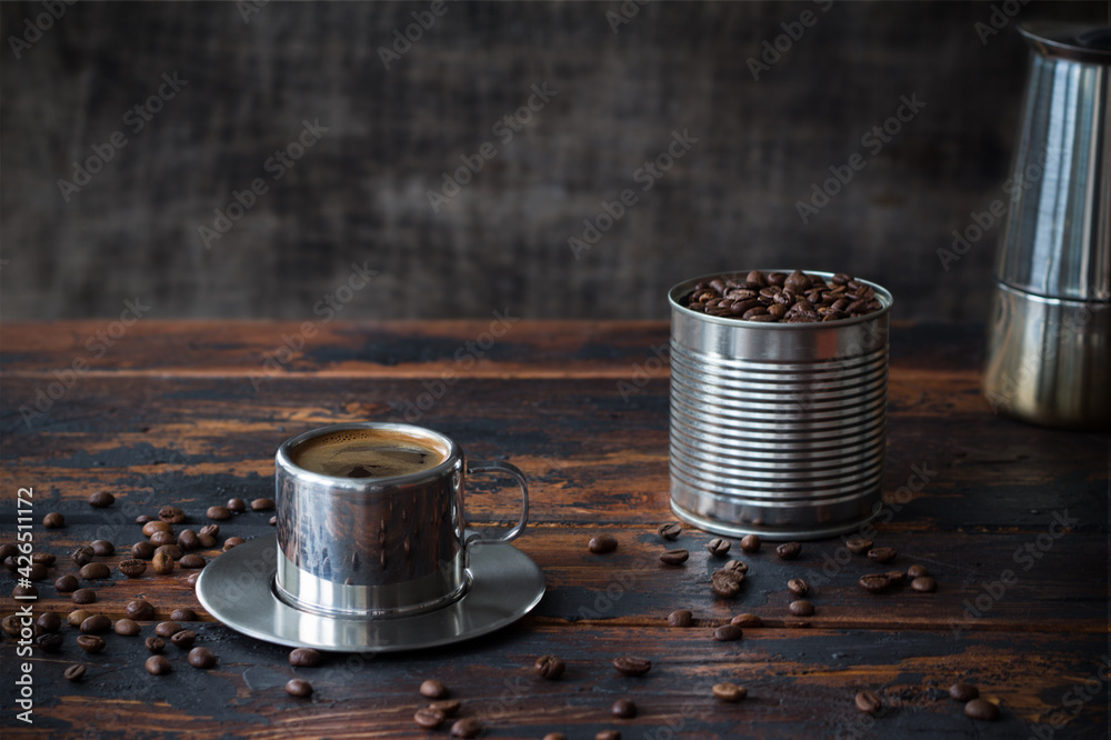 Steel cup of coffee, blended coffee beans in a tin can and geyzer coffee maker on a dark rustic wooden table among scattered coffee beans, blended, vintage