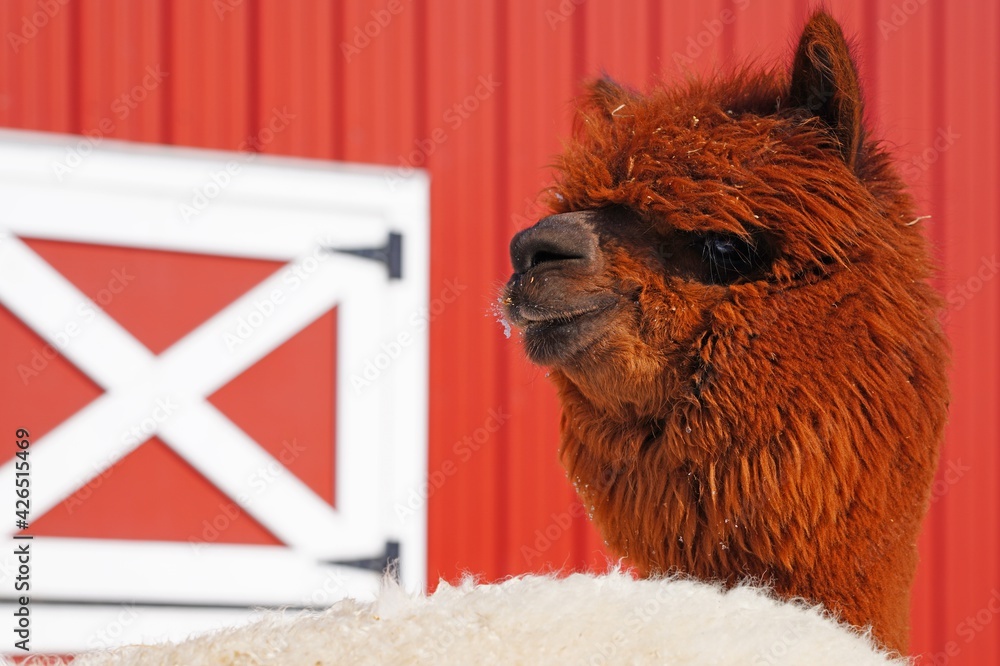 Portrait of a furry alpaca with snow on its face at a farm in New Jersey