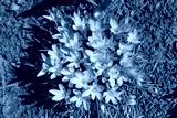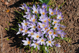 Purple crocus vernus flower peeking through the grass and mulch in early spring