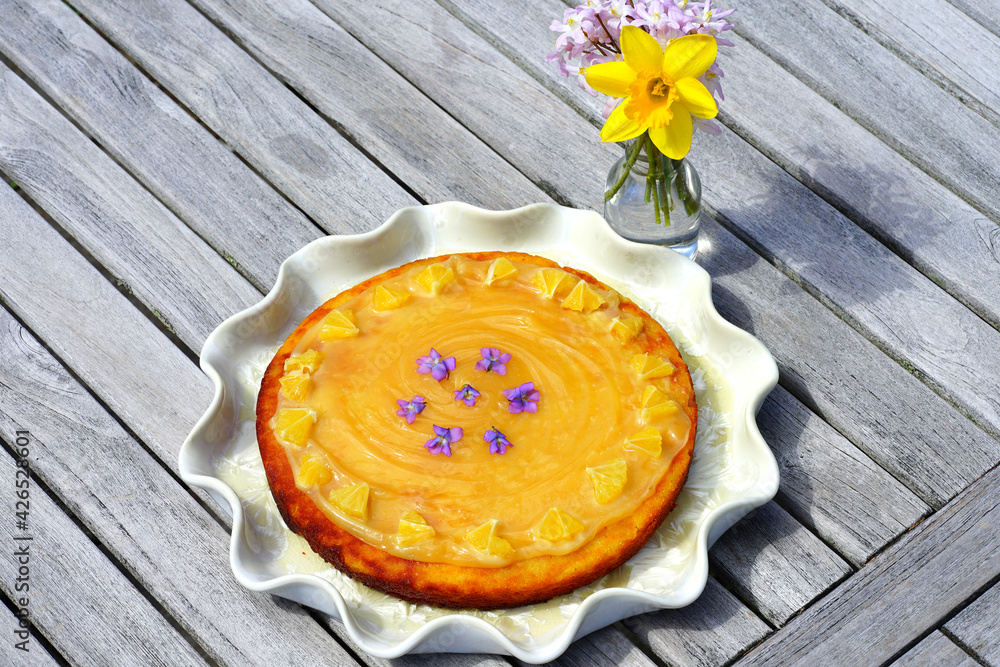 A round boiled Meyer lemon, almond and olive oil cake with sliced lemons and fresh violets on top
