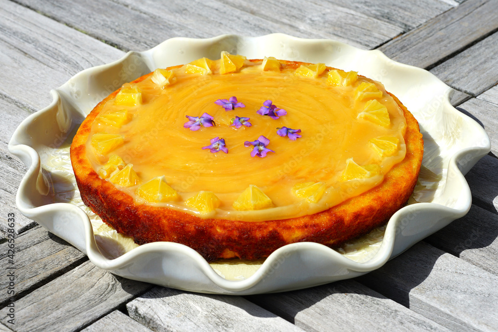 A round boiled Meyer lemon, almond and olive oil cake with sliced lemons and fresh violets on top