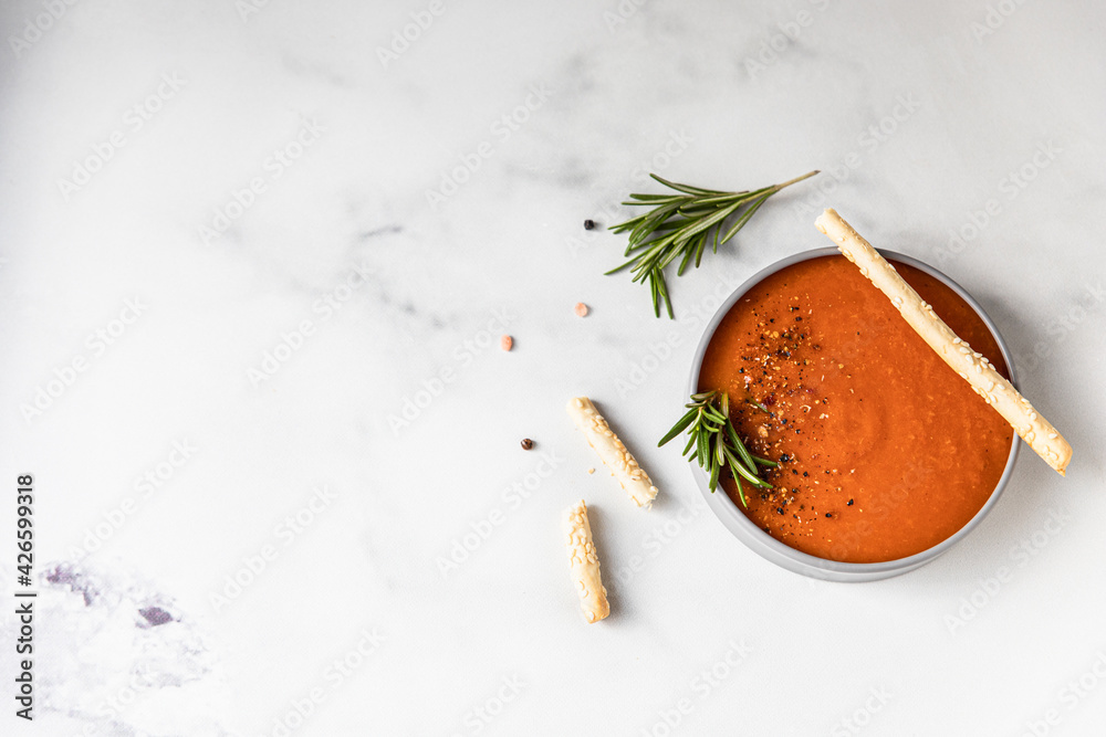 Tomato soup garnish with ground pepper, rosemary and bread sticks, light background. Top view. Copy space.