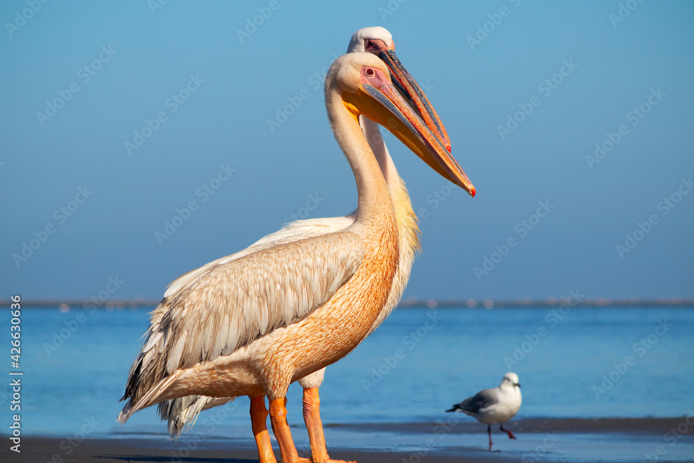 Wild african birds. A group of several large pink pelicans stand in the lagoon on a sunny day