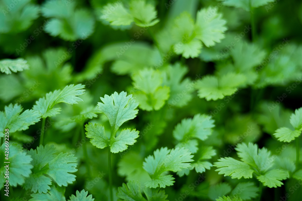 Close up Fresh growing green Coriander (Cilantro) leaves in Vegetable plot.